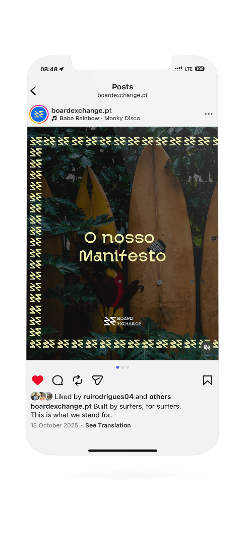 Board Exchange is a Portuguese brand dedicated to sell second-hand surf products. After its first growth phase, the founders felt the need to evolve the brand into something more mature, distinctive, and emotionally connected to surf culture. The goal was to create a new identity that communicates circularity, energy, and modernity, reinforcing the pride of giving surfboards a second life and choosing a more sustainable path within the surf world.